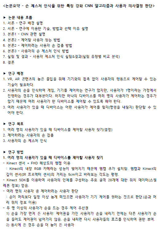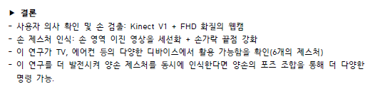 Kinect를 이용하기 전에 관련 연구 논문을 읽으며 공부를 해보고 있다. 지금 읽고 있는 논문은 손 제스처 인식 관련 연구 논문이다. 장창용, 김태용. (2020). 손 제스처 인식을 위한 특징 강화