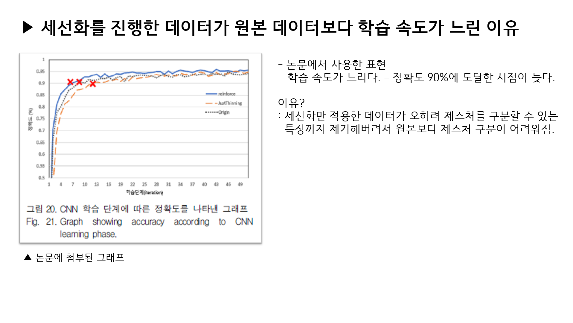 저번 랩미팅에서 교수님이 질문하신 부분에 대해 답을 드렸다. 논문에서 '세선화를 진행한 데이터가 원본 데이터보다 학습 속도가 느리다.'고 했는데, 사실 이 표현은 우리가 생각하는 표현과 다른 의미로 쓰인 것이었다. 처음에는 세선화를 진행한 데이터가 원본 데이터보다 분석해야 할 픽셀 수가 적은데, 왜 학습 속도가 느린지에 대해 이해하기가 힘들었다. 그런데 논문에서 말하는 '학습 속도가 느리다'라는 말은 '정확도가 90%에 도달하는 시점이 늦다'라는 뜻으로 사용되고 있었다. 다시 말해 세선화된 데이터가 원본 데이터보다 단순해진 건 맞지만, 제스처를 구분할 수 있는 특징까지 단순해져버려 정확도가 높아지는 시점이 늦어진 것이다. 이 부분에 대해 내가 이해하셨다고 판단한 건지 더이상의 질문은 없으셨다.