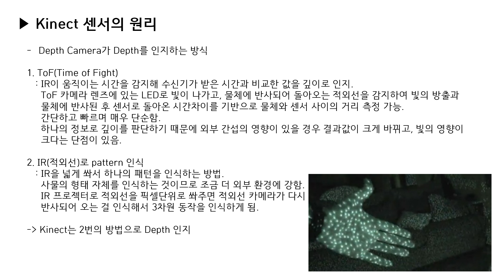 두 번째 랩미팅에서는 ppt도 만들어서 공부한 내용을 발표했다. 저번 랩미팅에서 받았던 질문인 '세선화를 진행한 데이터가 원본 데이터보다 학습 속도가 느린 이유'에 대한 답을 하고, Kinect 센서의 원리에 대해 탐구한 내용을 발표하였다. Kinect 센서의 원리에 대해 공부하려다가 첫 번째로, Depth Senser의 원리가 궁금해졌다. 그래서 Kinect가 Depth를 인지하는 방식에 대해 겉핥기식으로 공부했는데 랩미팅을 진행할수록 내 공부량이 부족하고, 열심히 하지 않았다는 것이 티가 났다. 사실 해당 주차에는 여행을 다녀와서 공부를 많이 하지 못했다는 핑계를 댔지만, 여행을 가지 않은 기간동안에도 열심히 하지 않았다... 반성이 필요할 것 같다.