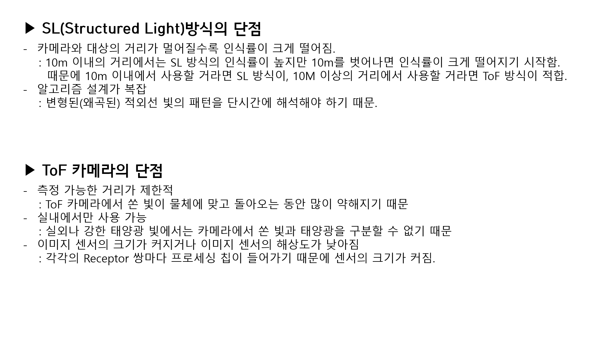 SL 방식의 단점은 그냥 읽어보면 되고, ToF 방식의 단점 중 실내에서만 사용 가능한 이유는, 태양광 안에 적외선이 포함되어 있어 실외에서는 카메라에서 쏜 적외선 빛과 태양광에 포함된 적외선을 구분할 수 없기 때문이다.