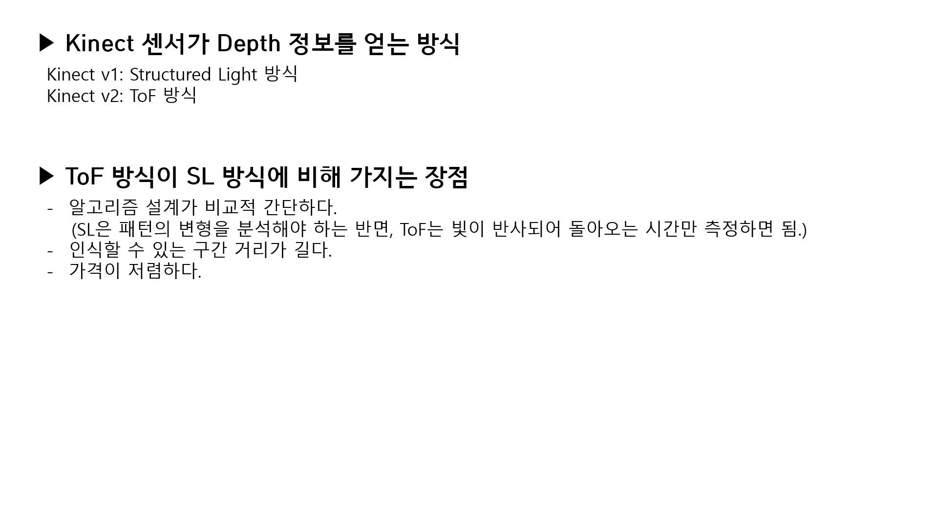 Kinect 센서가 깊이 정보를 얻는 방식은 버전 1에서는 SL 방식, 버전 2에서는 ToF 방식이라고 한다. 내가 이후 연구에서 사용할 기기는 Kinect Azure이다. 이 센서의 경우 어떤 방식을 이용하는지도 찾아보아야겠다.