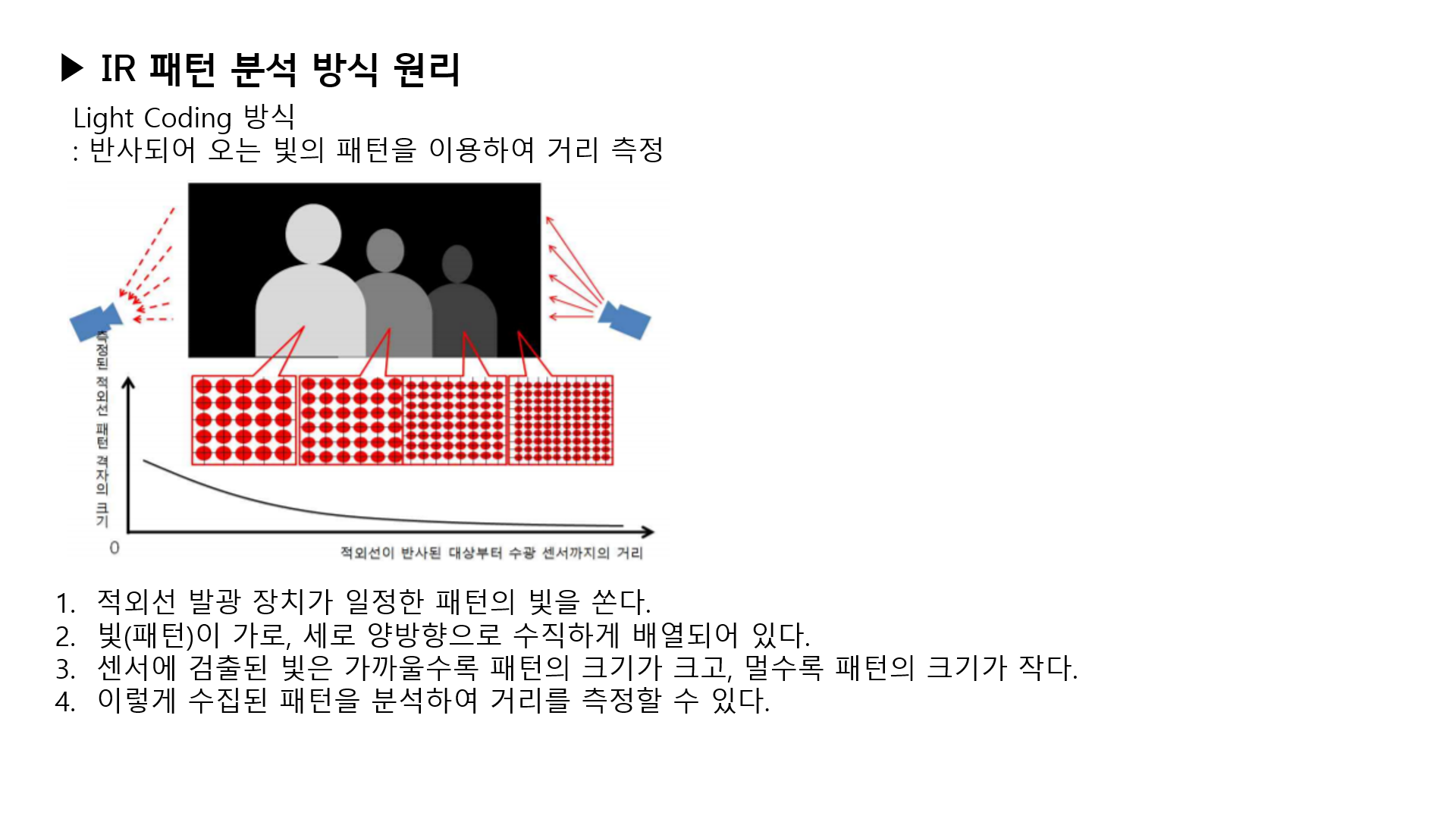 IR 패턴 분석 방식 중 Light Coding이라는 방식이 있었다. 적외선 빛을 쏘고, 반사되어 돌아온 빛(센서에 검출된 빛)의 패턴 크기에 따라 거리(깊이)를 계산하는 것이다. 패턴의 크기가 클수록 멀리 있는 것이고, 크기가 작을수록 가까이 있는 것이다.
