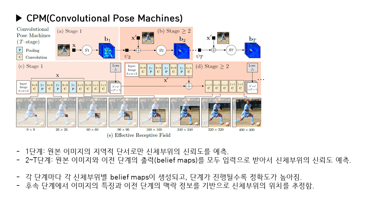 CPM 논문을 읽고 가장 핵심 원리라고 할 수 있는 것을 정리해보았다. 우선, CPM은 1~T단계에 걸쳐 신체부위를 추정하는데, 1단계에서는 원본 이미지에서 각 신체부위의 위치를 추정하게 된다. 그리고 2단계부터, 원본 이미지와 이전 단계에 추정한 데이터를 함께 입력으로 받아 신체부위를 추정한다. 그래서 2단계부터는 하나의 신체부위를 추정할 때 다른 추정치들을 참고하여 더 정확한 분석을 할 수 있는 것이다.