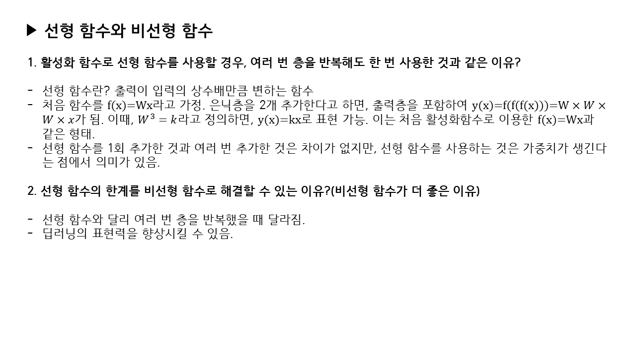 선형 함수와 비선형 함수에 대해 공부하면서, 활성화 함수의 역할에 대해 한 번 짚고 넘어가야겠다는 생각을 했다. 내용은 위 슬라이드만 보면 다 알 수 있다.