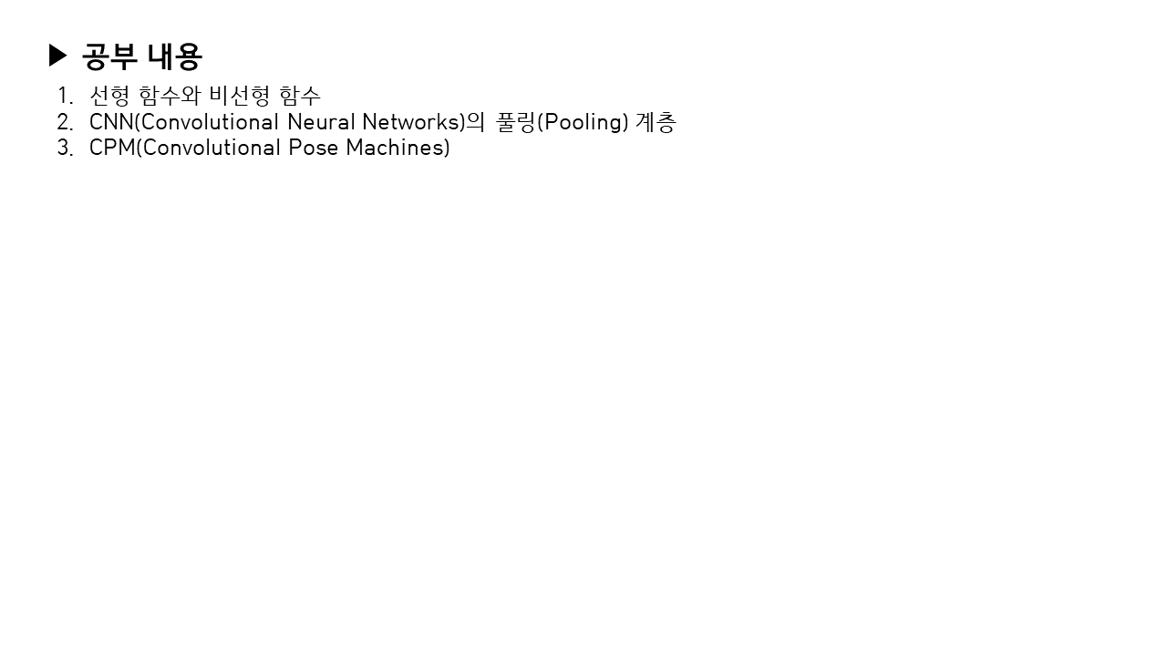 저번주 랩미팅에서 교수님이 질문하셨던 선형함수와 비선형함수에 대한 내용, CNN의 Pooling 계층에 대한 내용, CPM에 대한 내용을 공부해보았다. 2주간 집에 있어서 2~3주만의 랩미팅이 되었다. 그 기간동안 주로 CPM 연구 논문을 읽었는데, 영어로 되어있어 해석하는 데에만 거의 2주가 걸렸다.(사실 2주 내내 해석만 한 것은 아니지만 해석을 다 했을 때는 2주가 지나있었다.)