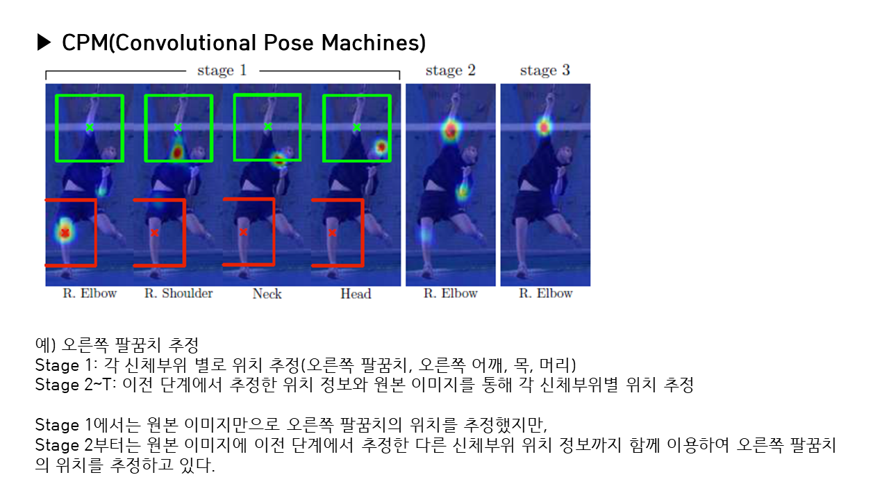 오른쪽 팔꿈치를 추정하는 것을 예로 들어보면, stage1에서는 원본 이미지에서 각 신체부위를 추정한다. 그런데 해당 이미지에서 오른쪽 팔꿈치의 위치가 잘못 추정되어 있고, 오른쪽 어깨와 목, 머리 부분은 비교적 잘 추정되어있다. stage2부터는 다른 신체부위의 위치(이전 단계에서 추정했던 위치)를 참고하여 오른쪽 팔꿈치를 추정하게 되는데, 이때 비교적 정확한 어깨와 목, 머리의 위치가 팔꿈치 위치를 추정하는 데 도움을 줄 수 있다. 이런 식으로 다른 신체부위와의 상관관계까지 고려하여 관절의 위치를 추적하는 것이다.