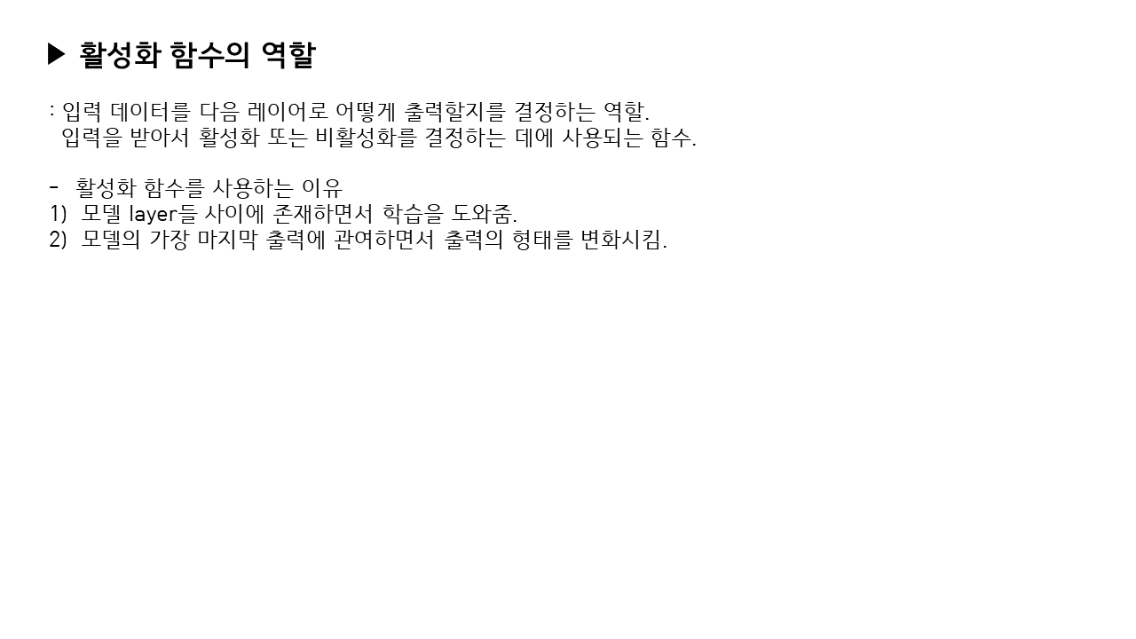선형 함수와 비선형 함수에 대해 공부하면서, 활성화 함수의 역할에 대해 한 번 짚고 넘어가야겠다는 생각을 했다. 내용은 위 슬라이드만 보면 다 알 수 있다.
