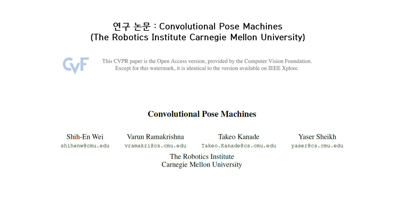 이 논문은 이번에 CPM 공부를 위해 새롭게 읽은 논문인데, 찾아보니 2016년에 작성된 논문이었다. CPM(Convolutional Pose Machines) 연구 논문이고, 읽으면서 이 내용을 다 이해하려면 기초 지식이 많이 필요할 거 같다는 생각이 들었다.