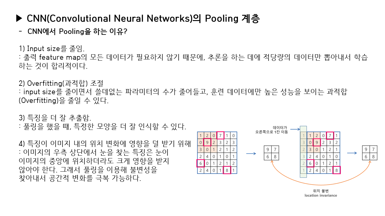 다음은 CNN에서 Pooling을 하는 이유에 대한 것이다. 이 내용도 위 슬라이드를 보면 알 수 있는데, 가장 중요하다고 할 수 있는 이유는 쓸데없는 정보를 줄이기 위해서이다. 풀링을 하면 입력 데이터의 사이즈가 줄어들어 정보가 사라진다고 볼 수 있는데, 사실 특징을 추출하는 데에 이미지의 모든 정보가 필요한 것이 아니다. 필요없는 정보까지 학습하고 특징을 추출해낸다면 과적합이 발생할 수 있다. 그렇기 때문에 특징 추출에 사용되는 데이터를 줄여 합리적으로 학습을 하도록 구성한 것이다.