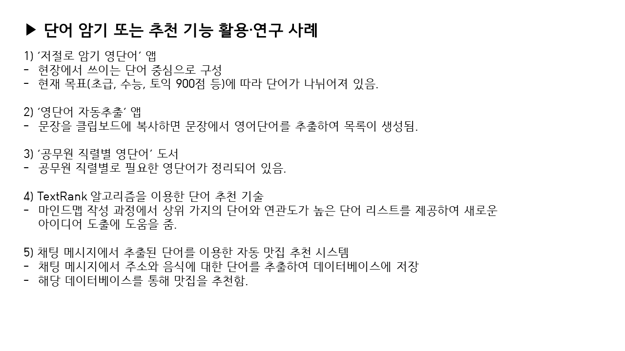 영단어 추천 공부로 연구 과제를 변경하기로 한 만큼, 그에 관련된 사례를 찾아보고 아이디어를 다시 계획 및 구체화시키는 시간을 가졌다.
