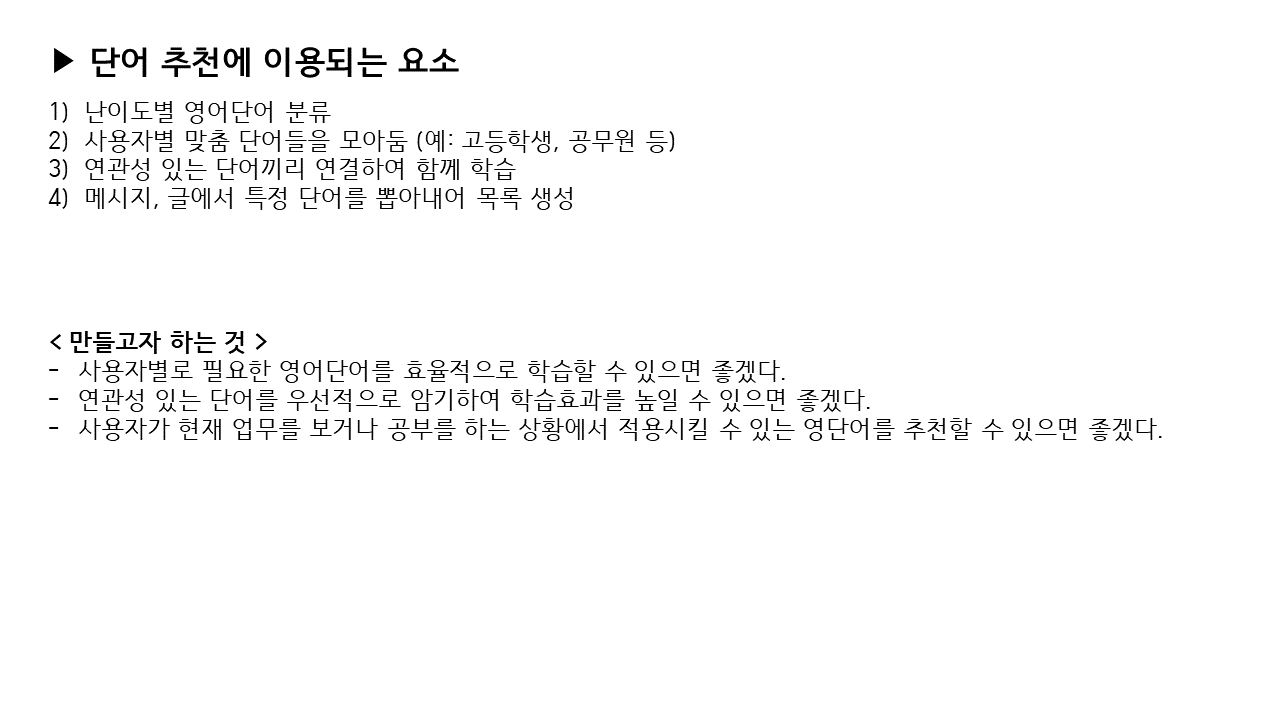 애초에 만들고자 한 것은 사용자의 검색 기록 등을 분석하여 어떤 분야에 관심이 있고 어떤 분야의 영어 공부가 우선적으로 필요한지 파악한 후 영단어를 추천해주는 것이었다. 하지만 실력적으로 구현하기에 어려운 부분이 있어 영어단어를 카테고리별로 분류하고, 사용자가 카테고리를 선택하여 영단어를 암기할 수 있도록 하는 방향으로 생각 중이었다.