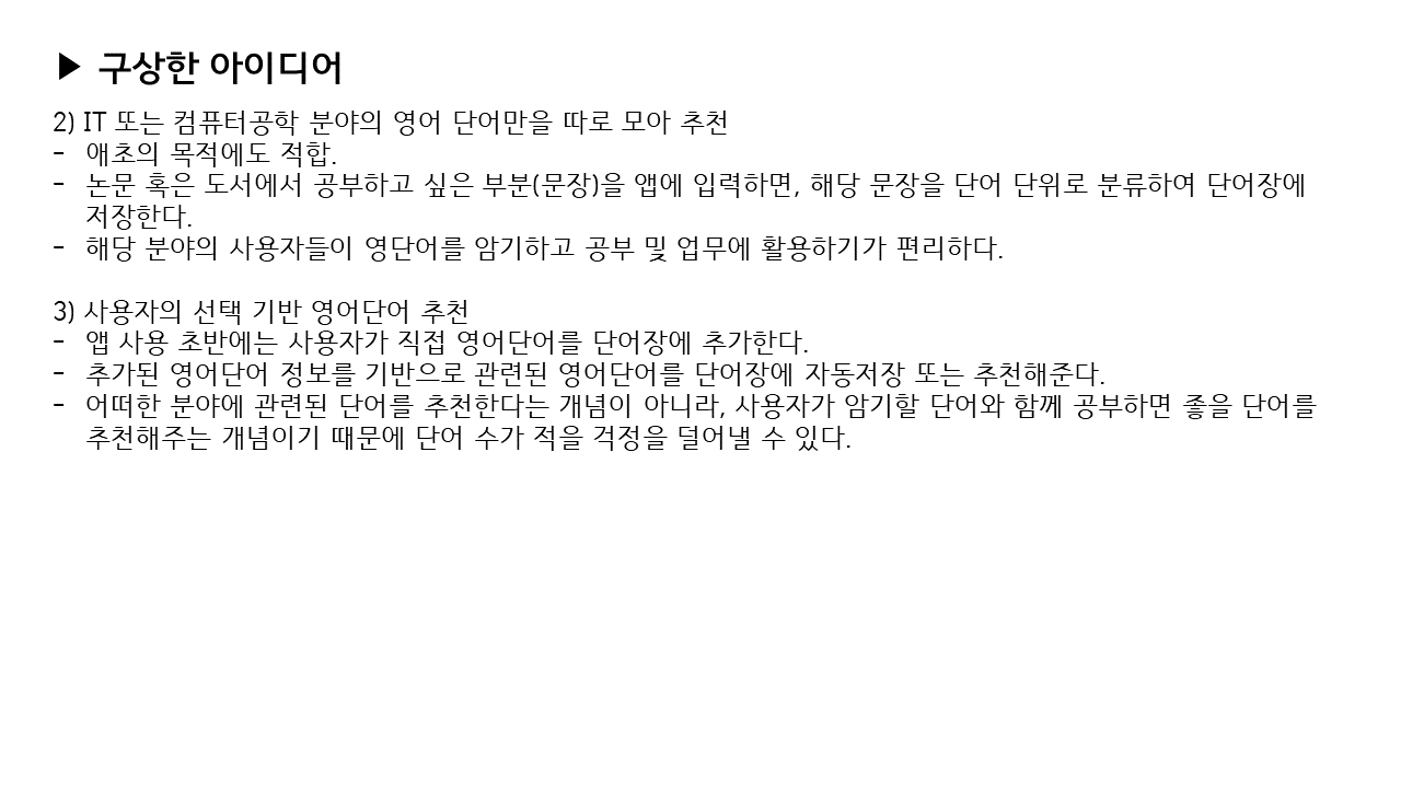 그런데 사례를 찾아보고 아이디어를 다시 구상해보니, 사용자가 초반에 영어단어를 선택하면, 그 영어단어와 연관성이 있는 영어단어를 단어장에 추가 및 추천해주는 방향으로 구현하는 것도 좋겠다는 생각이 들었다. 교수님과의 면담을 통해서도 이런 방향이 구현하기 더 쉬울 것이라는 의견을 받았고, 동아리 구성원들과의 이야기를 통해 해당 아이디어로 구현하기로 결정하였다.