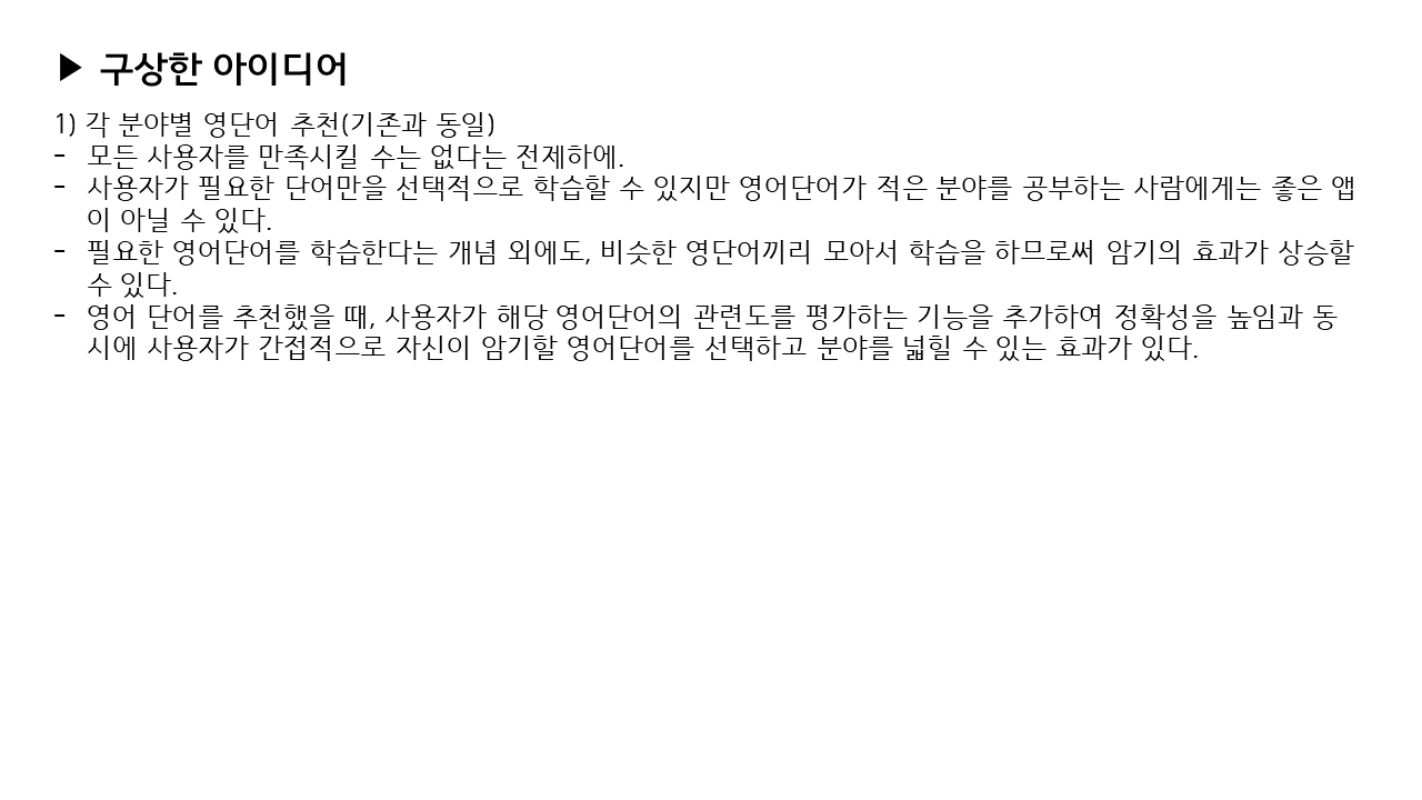 그런데 사례를 찾아보고 아이디어를 다시 구상해보니, 사용자가 초반에 영어단어를 선택하면, 그 영어단어와 연관성이 있는 영어단어를 단어장에 추가 및 추천해주는 방향으로 구현하는 것도 좋겠다는 생각이 들었다. 교수님과의 면담을 통해서도 이런 방향이 구현하기 더 쉬울 것이라는 의견을 받았고, 동아리 구성원들과의 이야기를 통해 해당 아이디어로 구현하기로 결정하였다.