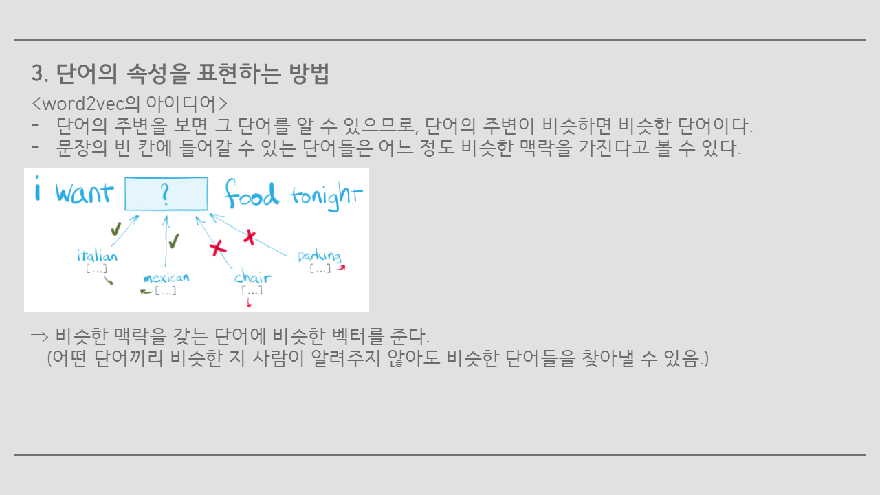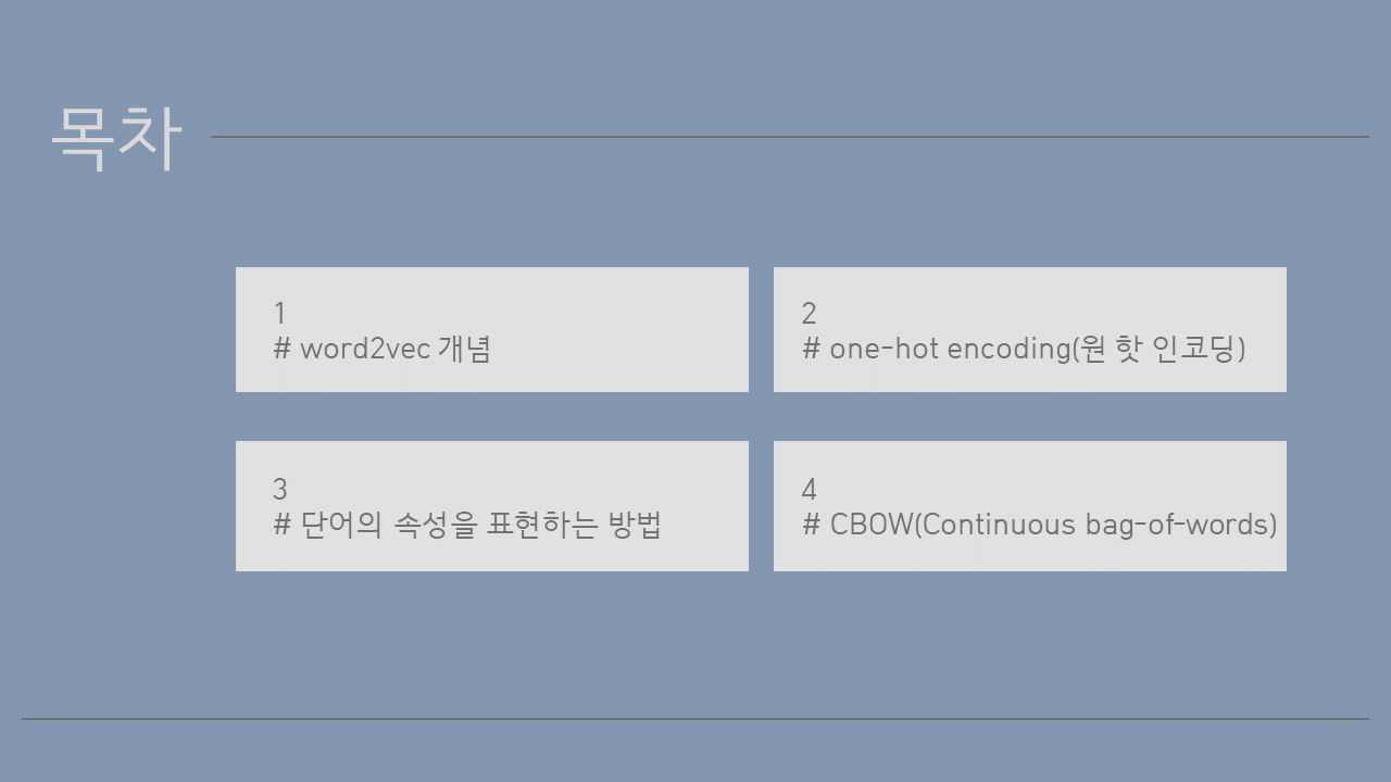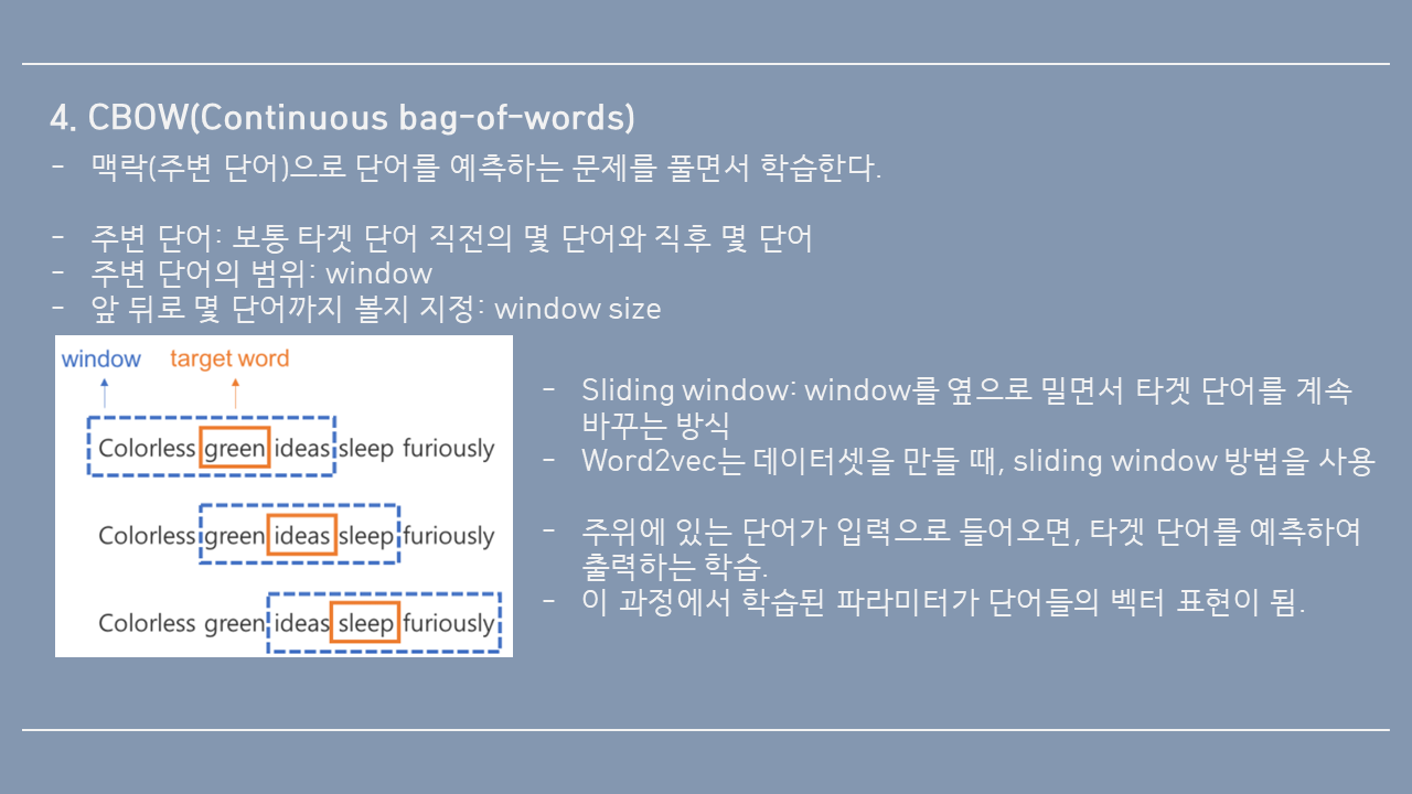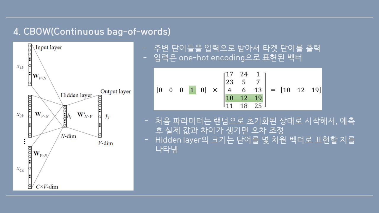 이 내용을 word2vec 방식 중 하나인 CBOW(Continuous bag-of-words)로 자세히 설명해보겠다.