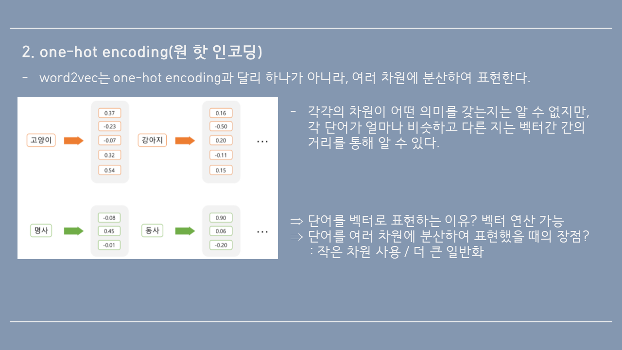 1) 적은 차원으로 대상을 표현할 수 있다. 원핫인코딩처럼 표현하면 단어의 수만큼 차원을 사용하지만, word2vec처럼 표현하면 차원의 크기를 설정하여 거기에 맞춰서 벡터가 표현된다. 보통 20~200차원 정도 사용.