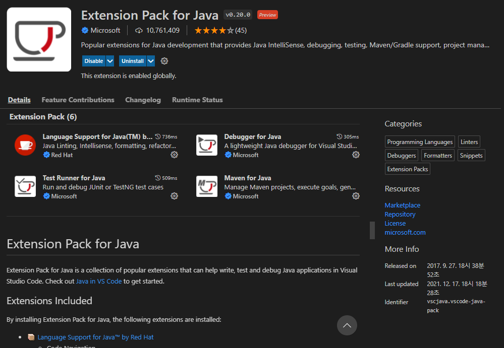 이름이 조금 다르긴 하지만 'Java Extension Pack'라는 게 없었고, 사실상 이름의 의미는 비슷한데다 아이콘 모양까지 같아서 그냥 이걸 다운 받았다. 게다가 다운로드 수도 많아서 믿음이 갔다.