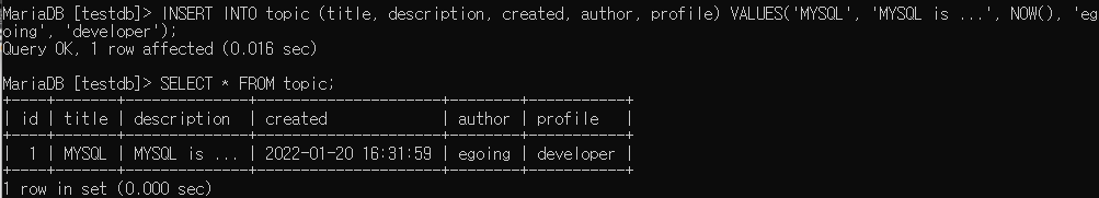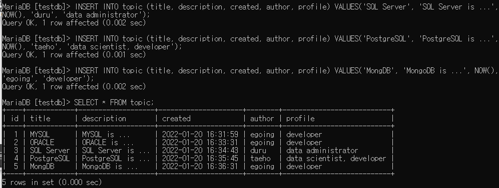 : 각 필드에 대입되는 값을 작성하여 테이블에 입력.