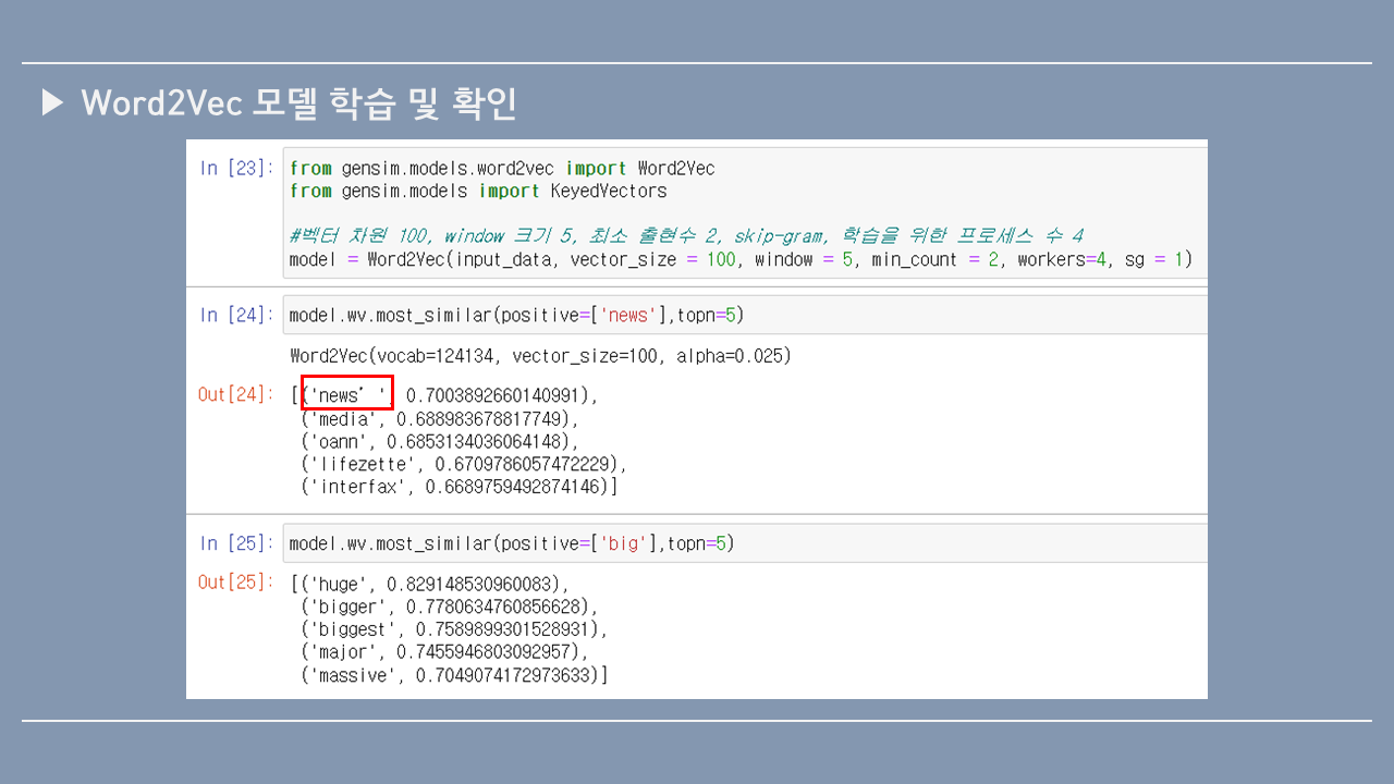 word2vec 모델을 직접 이용하여 데이터 학습을 시켰을 때 원하는 값이 나오는지 확인을 해보았다.