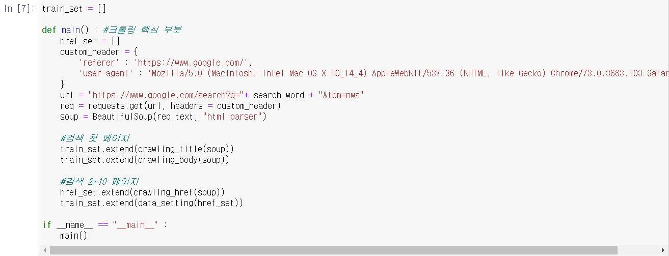 메인 함수. 제목과 본문 텍스트를 다 받아오면 train_set이라는 리스트에 모두 저장한다.