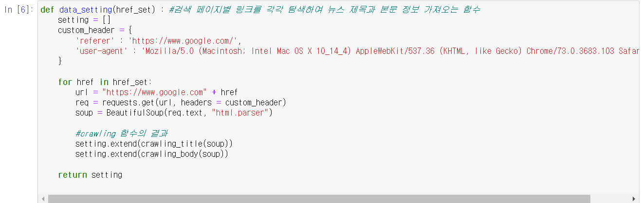 위에서 가져온 각 페이지별 링크를 받아 제목과 본문을 추출하도록 하는 함수이다. main 함수에서 crawling_href 함수를 호출해 링크를 받은 뒤, 그 링그를 data_setting 함수의 매개변수로 넘겨준다.