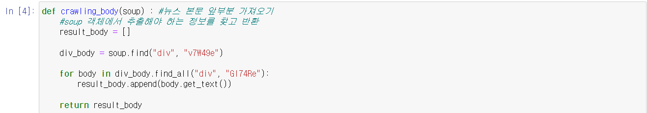 뉴스 본문 내용을 가져오는 코드이다. 방법은 제목을 가져올 때와 같다. 지금 생각해보니 제목과 본문을 가져오는 함수를 굳이 따로 둘 필요가 있었나 싶다. 나중에 합쳐봐야겠다
