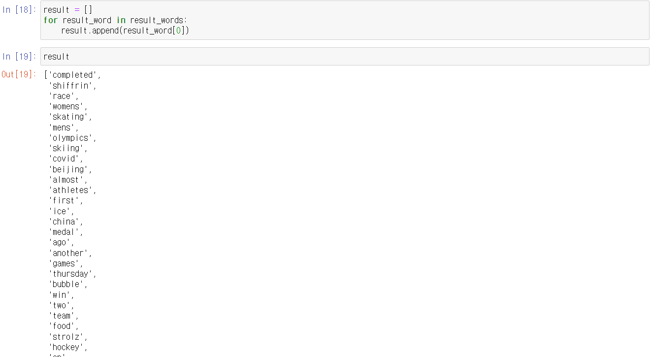 원래 문장 형태였던 데이터를 단어 형태로 자르고, a, an, is 등 의미 없는 단어와 특수문자를 제거한다. 같은 문장에 포함되었던 단어는 같은 리스트에 들어가게 된다.