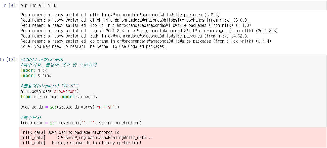 이제 여기서부터 전처리가 시작된다. 이 부분은 전처리를 하기 전 필요한 라이브러리를 다운 받는 단계이다. 불용어, 특수문자를 제거하기 위해 사용된다.