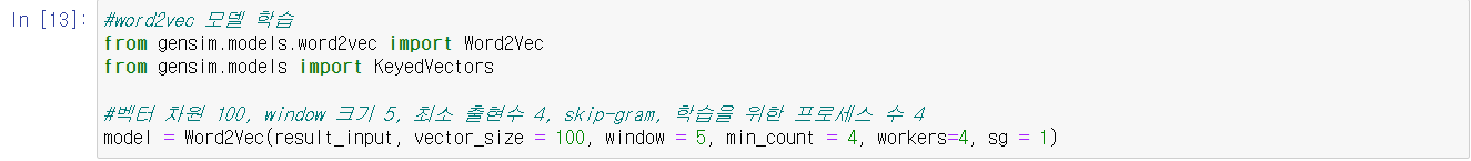 이제 전처리 된 학습데이터를 word2vec 모델에 학습시킨다.