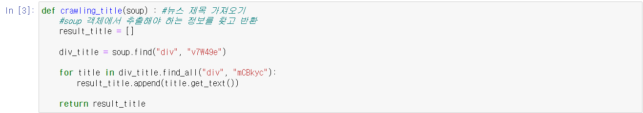 그 중에서도 뉴스 제목은 class명이 "mCBkyc"인 div로 감싸져 있는데, 제목이 포함된 div 코드를 받아온 뒤 ger_text()를 이용해 제목 부분만 추출한다. 그렇게 추출한 제목을 result_title이라는 리스트에 모두 저장하여 반환한다.