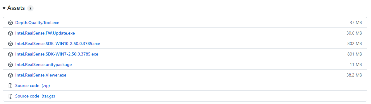 우선 위 사이트로 들어가서 Intel RealSense SDK 2.0을 다운로드 받는다. 위 사이트에서 설치 버튼을 누르면 깃허브 페이지로 이동되는데, 페이지 최하단에서 각자의 환경에 맞는 SDK를 선택하여 설치하면 된다.