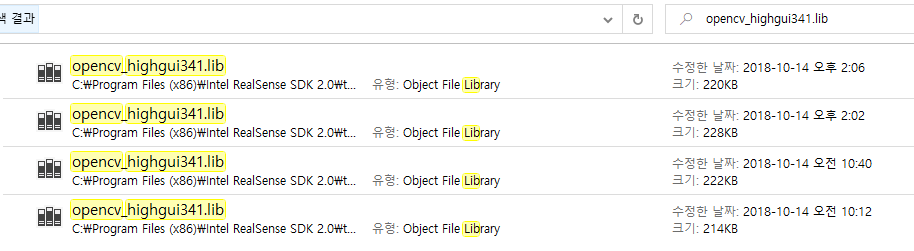 파일탐색기에서 opencv_highgui341.lib 파일의 위치를 찾아서 프로젝트 속성에 경로를 추가해줬다. 그랬더니 위 오류가 더이상 발생하지 않았다. 그리고 새로운 오류...