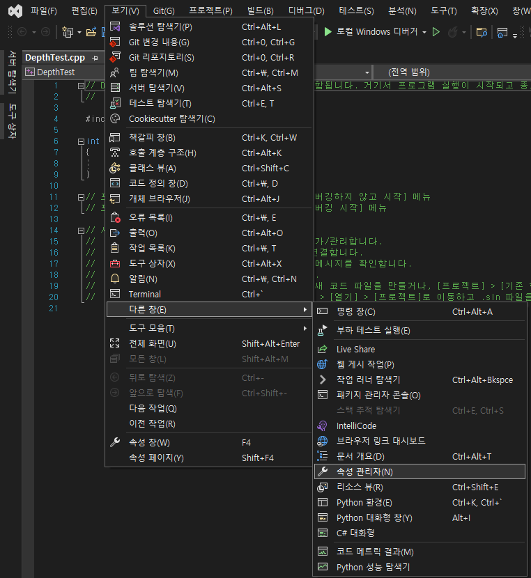 위 화면이 나타나면 '보기 > 다른 창 > 속성관리자'을 선택한다.