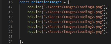 다음은 연속적으로 보여줄 로딩 이미지들을 animationImages라는 배열에 넣어주었다. 엄밀히 말하자면 이미지 파일을 넣은 것이 아니라 이미지 파일이 있는 경로를 저장해둔 것이다. 저 순서대로 반복해서 보여줄 것이다.