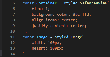 여기는 디자인적인 부분. 보통 Reac Native로 앱 개발을 하면 StyleSheet로 디자인을 많이 하지만, 나는 styled-components를 이용해서 디자인을 해주었다. 아직은 디자인이라고 할 정도는 아니지만, 배경색과 정렬 정도를 해줬다. styled-components를 이용하면 web 개발에서 css를 하는 것과 거의 유사한 형태로 디자인을 할 수 있게 된다. 웹 개발에 익숙한 사람에게는 StyleSheet보다 훨씬 편한 것!
