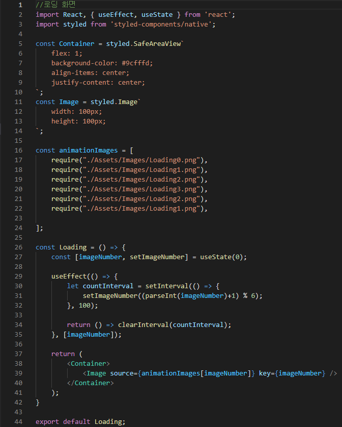 그리고 로딩 화면을 구성하는 Loading.js 파일. 하나하나 설명을 해보자면,