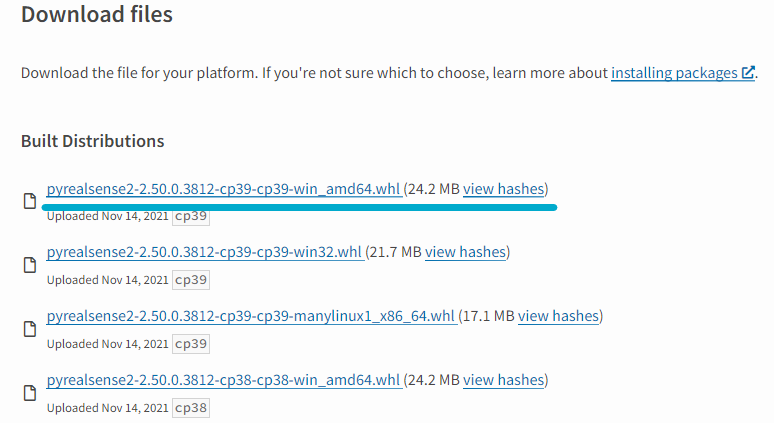 파이썬이랑 같은 버전을 사용해야 한다는데, 나는 파이썬 3.9.7 버전을 사용 중이다. realsense2 wrapper는 39라고 되어있는 걸 보니 3.9 버전인 것 같다. 그대로 사용하겠다.