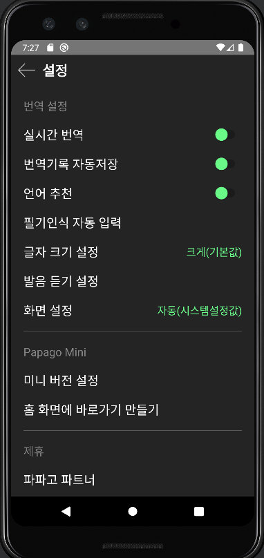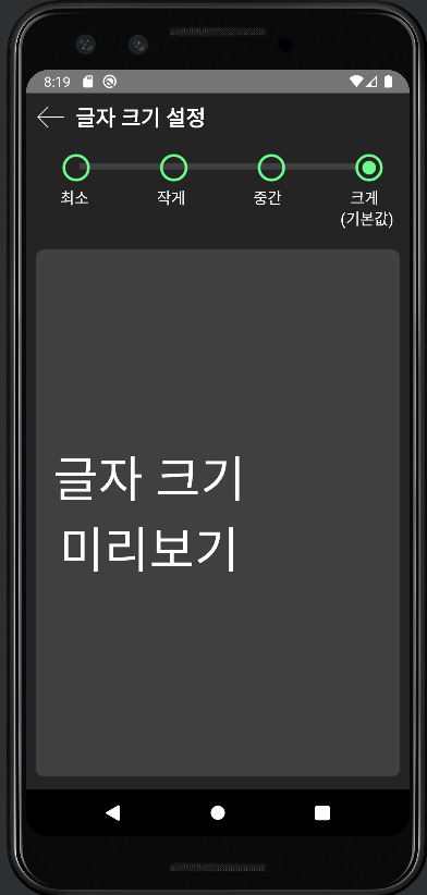 글자 크기 선택하는 부분을 FrameLayout으로 해서 View위에 RadioButton 겹쳐서 배열했는데, 라디오 버튼 뒤로 선이 보이는 문제가 발생했다. 스터디를 통해 라디오 버튼의 background를 줘서 변경 가능할 것 같다는 피드백을 받았다.