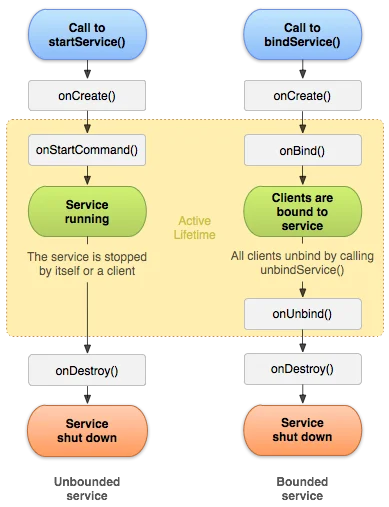 - 위의 그림은 startService()에 의해 생성된 Service와 bindService()에 의해 생성된 Service를 구분