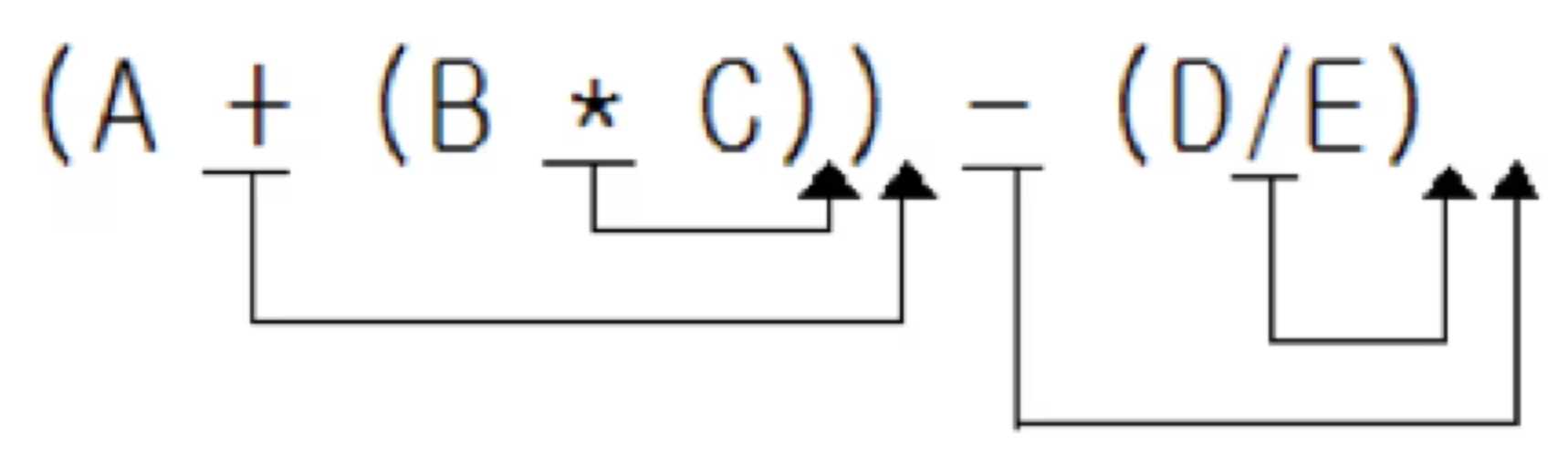 다른 예를 들어 그림으로 표현하면 A+B*C-D/E를 완전하게 괄호로 묶고 연산자를 이동시킬 장소를 표시하면 다음과 같이 된다.