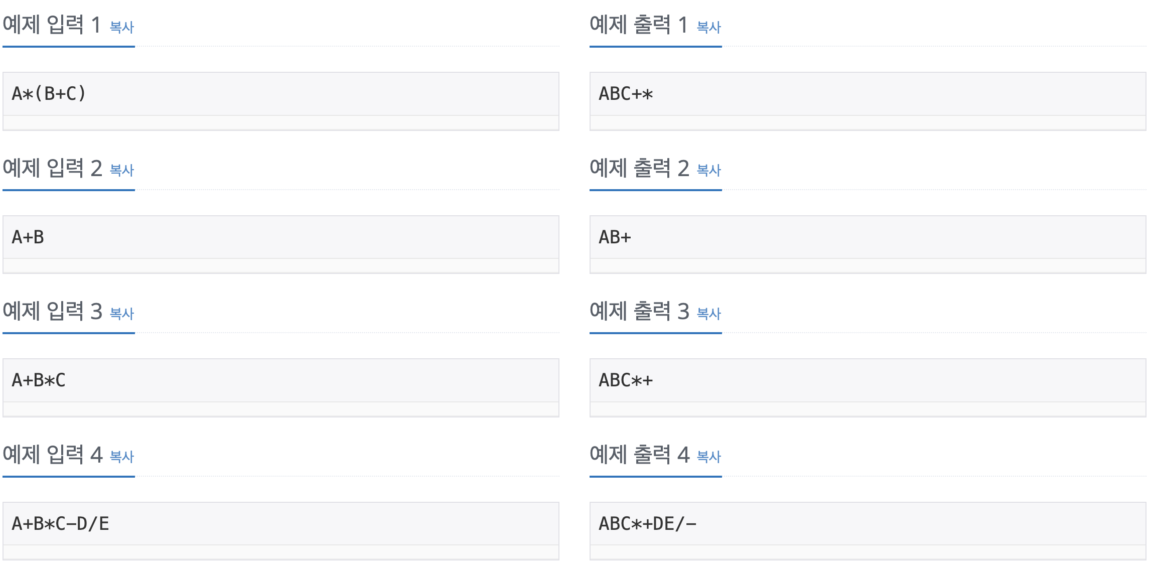 예를 들어 a+b*c는 (a+(b*c))의 식과 같게 된다. 그 다음에 안에 있는 괄호의 연산자 *를 괄호 밖으로 꺼내게 되면 (a+bc*)가 된다. 마지막으로 또 +를 괄호의 오른쪽으로 고치면 abc*+가 되게 된다.