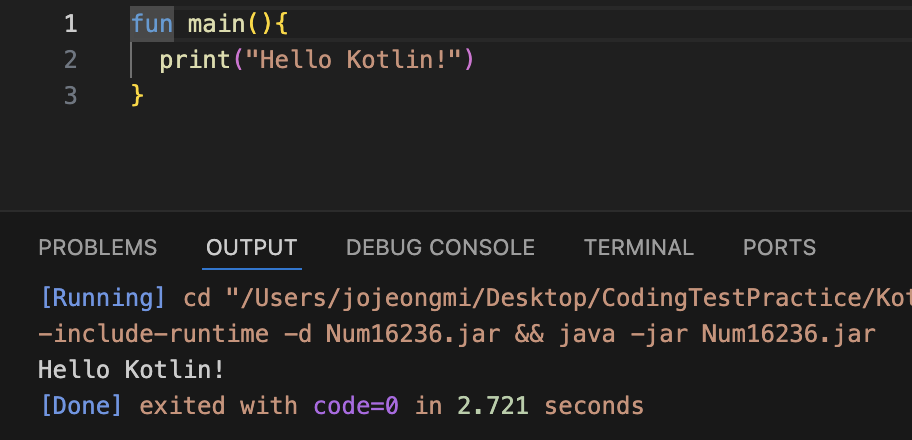 코테 연습을 Java로 하다가 Kotlin으로 해보려고 개발 환경을 세팅했다. 안드로이드 개발할 때 kotlin을 쓰고 있었지만 VScode에서 Kotlin 코드를 쓸 일이 없었기 때문에 처음 세팅하게 되었다.