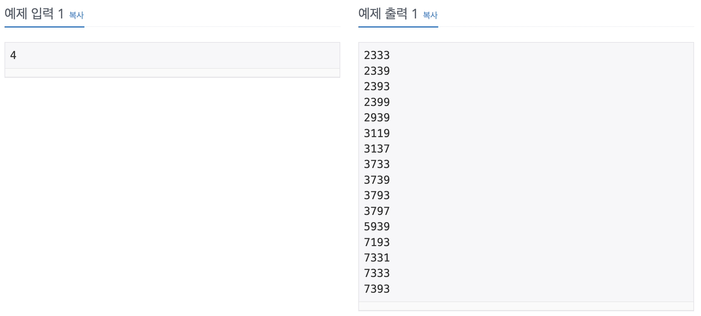 수빈이는 N자리의 숫자 중에서 어떤 수들이 신기한 소수인지 궁금해졌다. N이 주어졌을 때, 수빈이를 위해 N자리 신기한 소수를 모두 찾아보자.