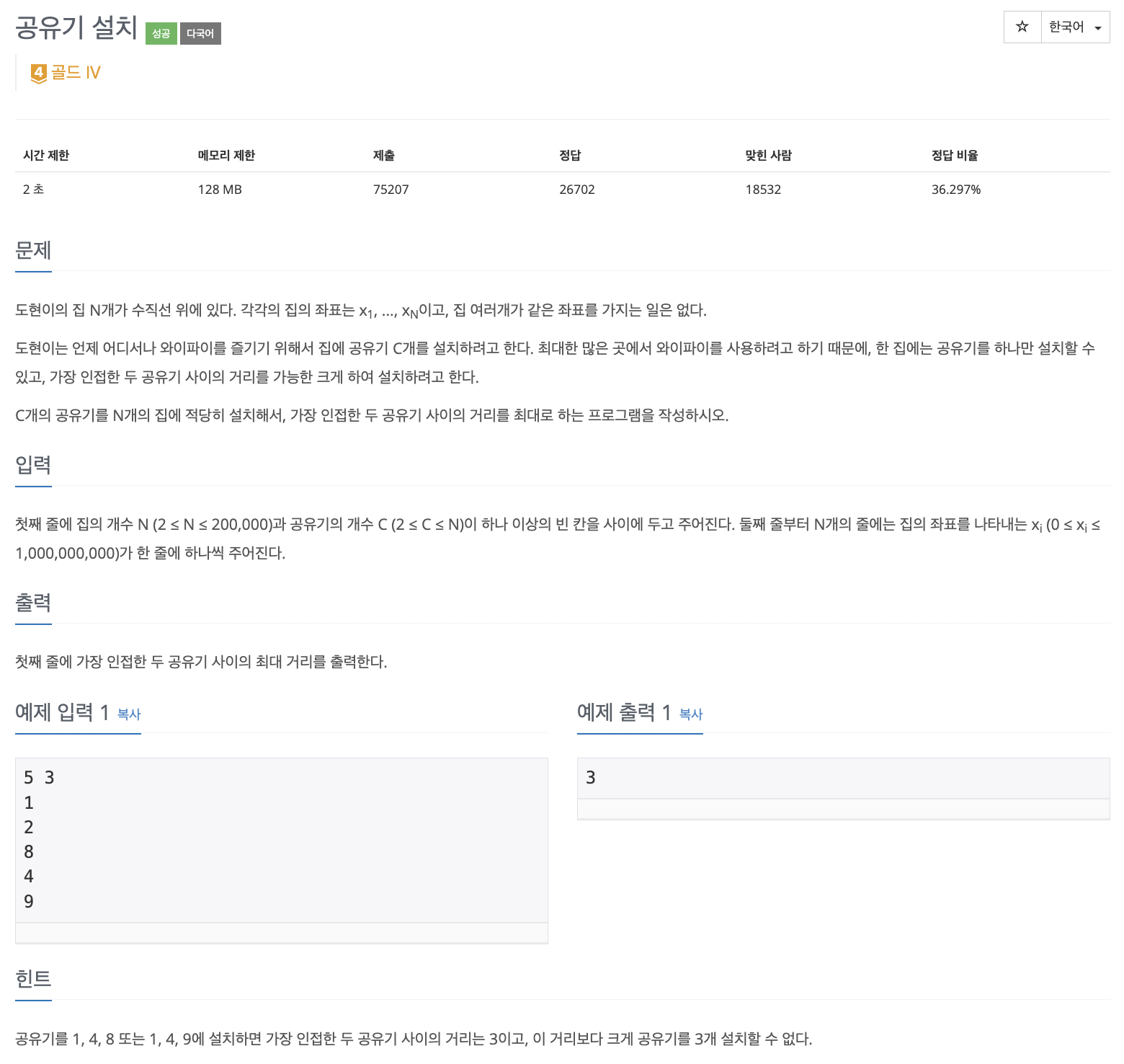 - 최소거리가 d일 때 몇 개의 공유기를 설치할 수 있는지를 체크해서 최소거리의 최대를 찾기