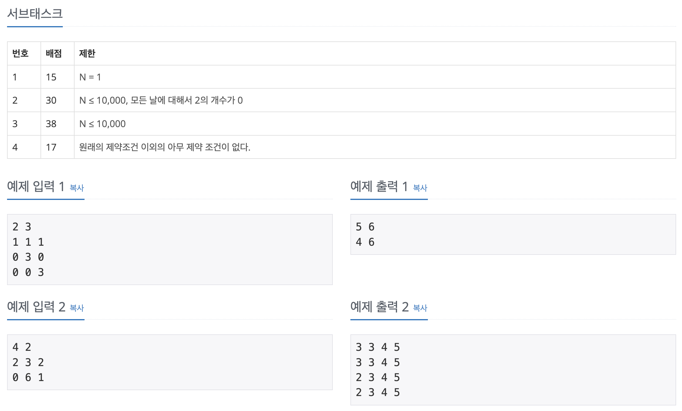 - 제일 왼쪽 열과, 제일 위쪽 행의 애벌레들은 자신이 자라는 정도를 스스로 결정한다. 이들은 입력으로 주어질 것이다. 애벌레들이 자라는 정도를 왼쪽 제일 아래 칸에서 시작하여 위쪽으로 가면서 읽고, 제일 위쪽 칸에 도착하면 오른쪽으로 가면서 행의 끝까지 읽었다고 하자. 모든 입력에서 이렇게 읽은 값들은 감소하지 않는 형태이다.