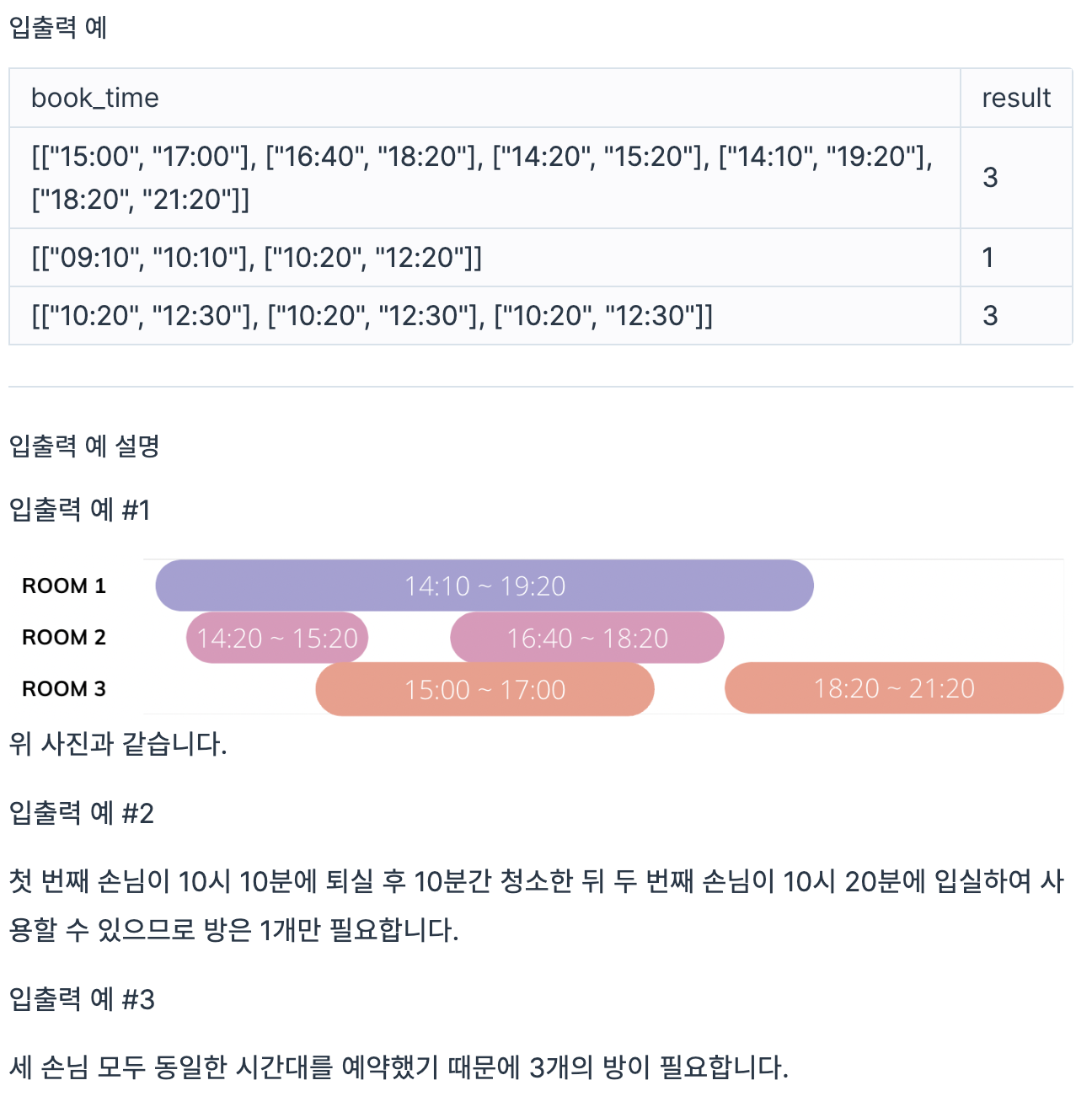 - book_time[i]는 ["HH:MM", "HH:MM"]의 형태로 이루어진 배열입니다