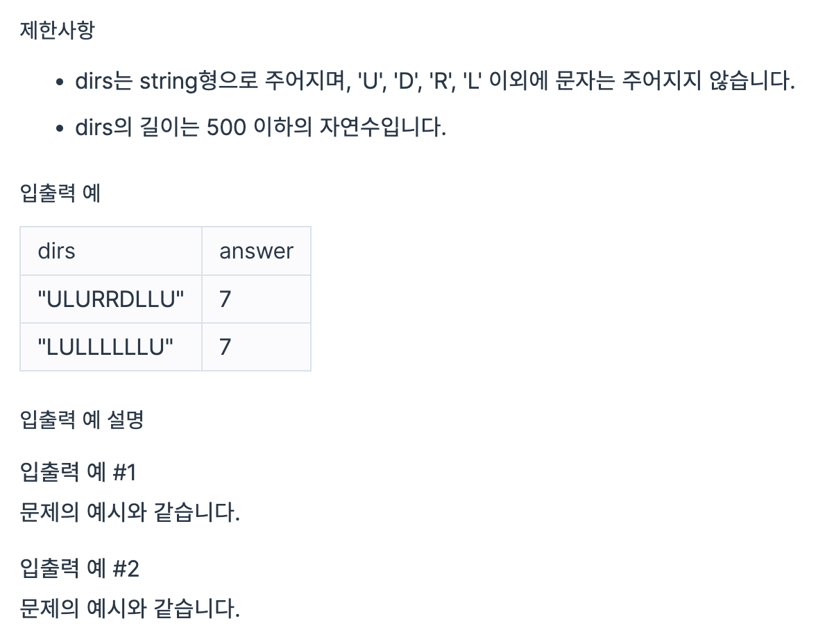명령어가 매개변수 dirs로 주어질 때, 게임 캐릭터가 처음 걸어본 길의 길이를 구하여 return 하는 solution 함수를 완성해 주세요.