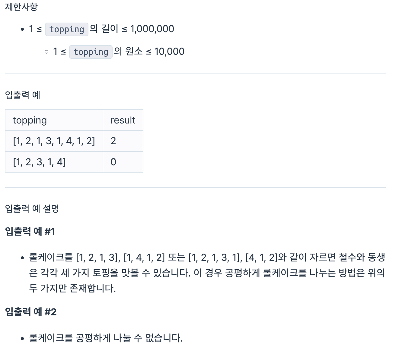 예를 들어, 롤케이크에 4가지 종류의 토핑이 올려져 있다고 합시다. 토핑들을 1, 2, 3, 4와 같이 번호로 표시했을 때, 케이크 위에 토핑들이 [1, 2, 1, 3, 1, 4, 1, 2] 순서로 올려져 있습니다. 만약 세 번째 토핑(1)과 네 번째 토핑(3) 사이를 자르면 롤케이크의 토핑은 [1, 2, 1], [3, 1, 4, 1, 2]로 나뉘게 됩니다. 철수가 [1, 2, 1]이 놓인 조각을, 동생이 [3, 1, 4, 1, 2]가 놓인 조각을 먹게 되면 철수는 두 가지 토핑(1, 2)을 맛볼 수 있지만, 동생은 네 가지 토핑(1, 2, 3, 4)을 맛볼 수 있으므로, 이는 공평하게 나누어진 것이 아닙니다. 만약 롤케이크의 네 번째 토핑(3)과 다섯 번째 토핑(1) 사이를 자르면 [1, 2, 1, 3], [1, 4, 1, 2]로 나뉘게 됩니다. 이 경우 철수는 세 가지 토핑(1, 2, 3)을, 동생도 세 가지 토핑(1, 2, 4)을 맛볼 수 있으므로, 이는 공평하게 나누어진 것입니다. 공평하게 롤케이크를 자르는 방법은 여러가지 일 수 있습니다. 위의 롤케이크를 [1, 2, 1, 3, 1], [4, 1, 2]으로 잘라도 공평하게 나뉩니다. 어떤 경우에는 롤케이크를 공평하게 나누지 못할 수도 있습니다.