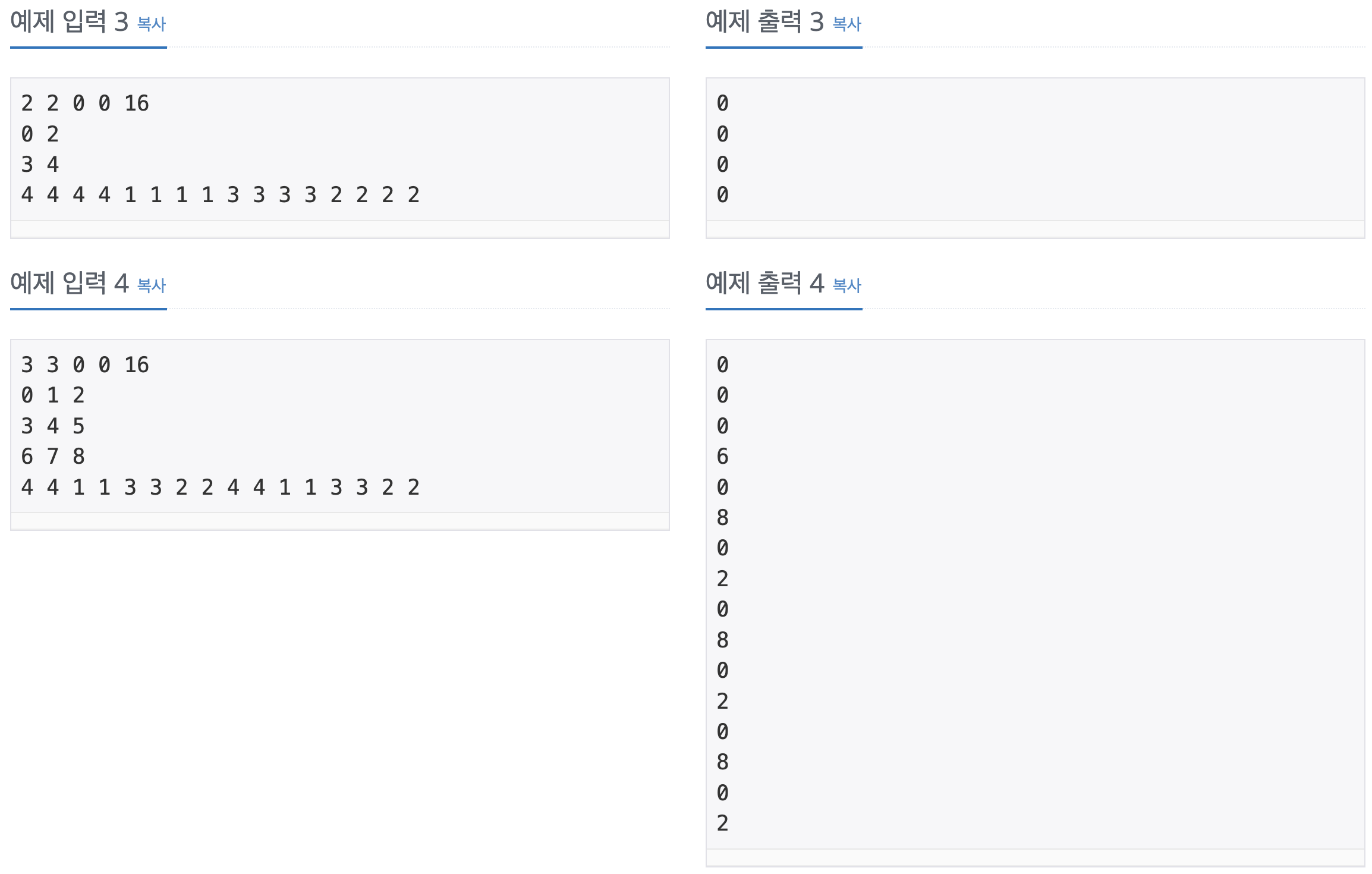 첫째 줄에 지도의 세로 크기 N, 가로 크기 M (1 ≤ N, M ≤ 20), 주사위를 놓은 곳의 좌표 x, y(0 ≤ x ≤ N-1, 0 ≤ y ≤ M-1), 그리고 명령의 개수 K (1 ≤ K ≤ 1,000)가 주어진다.
