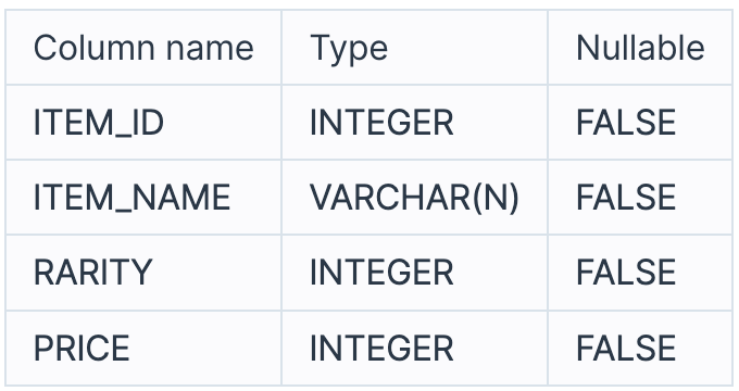다음은 해당 게임에서 사용되는 아이템 정보를 담은 ITEM_INFO 테이블과 아이템 관계를 나타낸 ITEM_TREE 테이블입니다. ITEM_INFO 테이블은 다음과 같으며, ITEM_ID, ITEM_NAME, RARITY, PRICE는 각각 아이템 ID, 아이템 명, 아이템의 희귀도, 아이템의 가격을 나타냅니다.