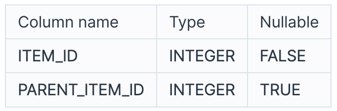단, 각 아이템들은 오직 하나의 PARENT 아이템 ID를 가지며, ROOT 아이템의 PARENT 아이템 ID는 NULL 입니다.